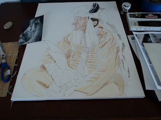 Ron "Mac" McMillan is a coworker of mine at a Warehouse in KC. Mac is an American Indian and does demonstrations of Indian life and is known as the Turtle Storyteller. He traded me a 25 year old beautiful, handmade flute. Pictured below. The Painting was colored with Winsor & Newton watercolors on stretched watercolor canvas and is 16x20. I think I received the better deal.
